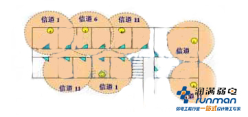 2) 無線頻道分布圖 由于AP較多,應注意AP的信道規劃。相鄰3個區域內要采用完全不干擾的頻段,如信道1、6、11。